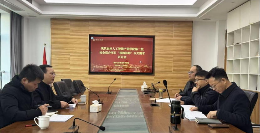 2025年12月18日上午,现代农林人工智能产业学院举行第二批校企联合项目“揭榜挂帅”攻关需求研讨会。杭州感知科技有限公司总经理杨来邦,副总经理王永众,威廉希尔兼现代农林人工智能产业学院院长冯海林,威廉希尔党委书记何振波、副院长胡军国参会。