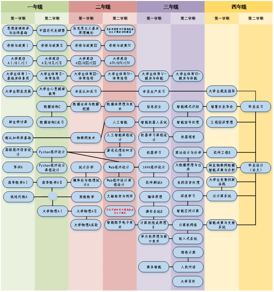 This major focuses on the cultivation of artificial intelligence application, big data processing, intelligent software and hardware development, closely around the talent training goal of the combination of intelligent science and agriculture and forestry. Implementing the personnel training mode of combining general education courses, subject courses and personality development courses, creates school-enterprise cooperation and discipline competition talent training systems, fully explores students' innovation and entrepreneurship ability, and constructs the "Production, Teaching, Research and Development" the "Four in One" and deep integration closed-loop talent training mode highlights students' comprehensive professional quality in intelligent system development, artificial intelligence design and big data analysis. It has carried out industry university research cooperation with Alibaba, Hikvision, Netease and other domestic well-known enterprises, as well as local government departments, so as to continuously strengthen the cultivation of students' practical ability and characteristic talents.