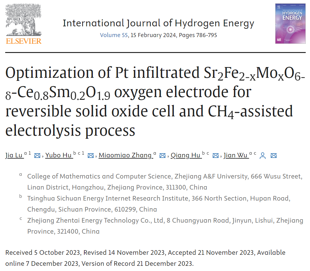 近日,物联网工程专业农村低碳能源物联网研究团队撰写的“Optimization of Pt infiltrated Sr2Fe2-xMoxO6-δ-Ce0.8Sm0.2O1.9 oxygen electrode for reversible solid oxide cell and CH4-assisted electrolysis process“(用于可逆固体氧化物电池和甲烷辅助电解过程的Pt浸渍Sr2Fe2-xMoxO6-δ-Ce0.8Sm0.2O1.9电极优化研究)论文发表在国际权威期刊《International Journal of Hydrogen Energy》(IF=7.2)上。本团队青年教师吕佳博士为共同第一作者(排序第一),研究生张妙妙为第二作者,吴剑副教授为通讯作者。Williamhill中文为第一单位。这是物联网工程专业首次在氢能领域发表高水平论文。