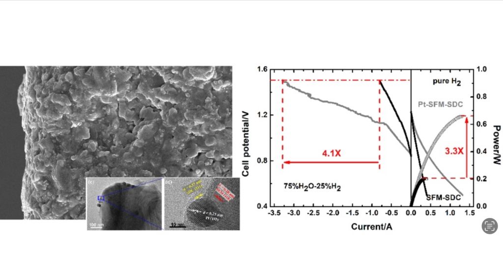大力发展可再生能源和碳减排已成为世界能源转型的重要趋势,绿氢电解池是能源互联网长时储能技术的关键器件之一。高温固体氧化物电池是一类高效、环境友好的“富余电制绿氢“器件。该文针对目前电池功率特性不足的问题,提出了一种简单快速的贵金属纳米颗粒负载策略,利用中高温诱导氯铂酸分解形成单质Pt,并结合新型电化学传感技术无损检测和识别浓度调控增强效应,制备出一种Pt纳米颗粒”均匀分散、强结合力“负载的多功能Sr2Fe2-xMoxO6-δ-Ce0.8Sm0.2O1.9电极。进一步的高分辨率电镜结果表明,这种新策略不仅赋予电极丰富的活性位点以促进析氧反应的发生,而且为氧气的扩散提供了理想的运输通道。最终使得电池的放电功率提升3.3倍,电解电流(产氢量)提升4倍以上。此外,该电极在甲烷辅助电制氢和合成气过程中也表现出出色的低功耗和可靠性,这对农村沼气等碳氢化合物的高值化利用具有重要指导意义。