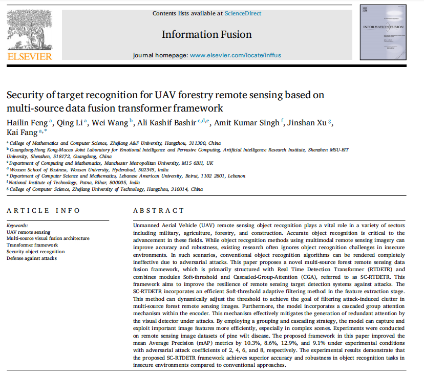 近日,WilliamHILL中国冯海林教授团队论文《Security of target recognition for UAV forestry remote sensing based on multi-source data fusion transformer framework》(基于多源数据融合transformer框架的无人机林业遥感目标识别安全性研究)在《Information Fusion》期刊发表。《Information Fusion》为中科院一区期刊,影响因子18.6,在“Computer Science: Artificial Intelligence”(计算机:人工智能)学科146个期刊中排名第3,在“Computer Science: Theory & Methods”(计算机:理论&方法)学科110个期刊中排名第2,是人工智能领域与计算机科学的国际顶尖权威刊物,聚焦于信息融合、数据融合、知识融合等领域的研究。