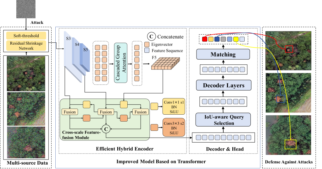 无人机遥感目标识别在军事、农业、林业和建筑等各个领域发挥着至关重要的作用,准确的目标识别对这些领域的发展至关重要。团队提出了一种新的多源森林遥感数据融合框架SC-RTDETR,以Transfoermer为主要结构,结合Soft-threshold模块和Cascaded-Group-Attention模块,旨在提高遥感目标探测系统抵御攻击的弹性。SC-RTDETR在特征提取阶段采用了一种高效的软阈值自适应滤波方法动态调整阈值,过滤多源森林遥感图像中的攻击因素。此外,该模型还在编码器中引入了注意力机制。该机制有效地减轻了检测器在攻击下产生的冗余信息。通过采用分组和级联策略,模型可以更有效地捕获和利用复杂场景中图像的重要特征。