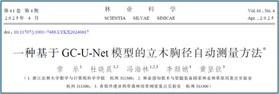 近日,威廉希尔冯海林教授团队的学术论文“一种基于GC-U-Net模型的立木胸径自动测量方法”一文在《林业科学》2025年第4期以封面论文发表。《林业科学》是林草科技领军期刊,入选中国科技期刊卓越行动计划,也是目前唯一被EI收录的中文林业科技期刊。该论文第一作者为威廉希尔22级农业信息化研究生常乐,通讯作者为冯海林教授。WilliamHILL中国为该论文第一单位和通讯作者单位。