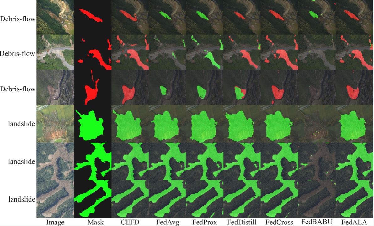 针对山洪灾害快速风险评估中面临的海量影像数据传输压力大、网络带宽受限等问题,结合无人机集群应用场景,引入联邦学习框架,实现数据本地处理与协同建模。提出了一种通信高效联邦蒸馏框架(CEFD)。通过构建轻量级多层知识表达机制,摒弃庞大参数的传输,选择高效地交换经过特征空间维度缩减的高级语义逻辑和关键中间特征。在服务器端引入自适应加权聚合策略,提升全局模型的稳定性与泛化能力。实验结果表明,在LSD公开数据集上,该方法在保证较高分割精度的同时,大幅降低通信开销,显著提升无人机集群在山洪灾害监测中的性能。