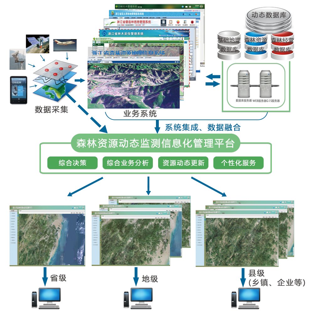 该平台基于学院15年林业信息化的研究成果,以县级为主体,管理上移至地区、省厅乃至国家,服务下延到乡镇(林场)、村、企业、农户,作业在山片,以森林资源基础档案为基础,以森林经营利用与保护为补充,基于地理信息、森林自然消长、采伐管理、营造林管理、林地征占用管理、森林防灾管理、行政处罚管理等管理系统或数据,通过系统集成、数据融合与建模,使森林资源数据由静变动,实时更新。