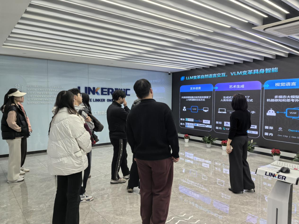 在联汇科技展厅,企业负责人向师生展示了公司在多模态人工智能、大数据分析等领域的创新成果,重点介绍了其自主研发的"OmModel"多模态大模型在智慧城市、智能客服等场景的应用案例。并且详细解读了企业的人才需求方向,指出"算法优化能力"和"跨领域实践能力"是当前招聘的核心关注点。现场学生踊跃提问,围绕职业发展路径、实习岗位要求等问题与企业代表深入探讨。