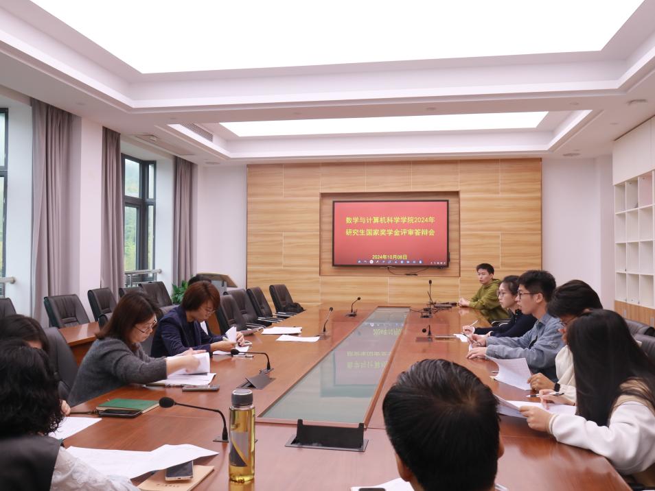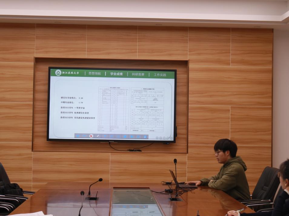 学生办负责人介绍了2024年国家奖学金评审的相关政策。四名研究生以PPT演讲答辩的方式从思想道德、学业成绩、学科竞赛、科研创新、综合拓展素质等多方面进行了风采展示。整体汇报展现了各候选人在校期间取得的优异成绩以及良好的语言表达能力和逻辑思维能力,获得了评审老师的一致好评。