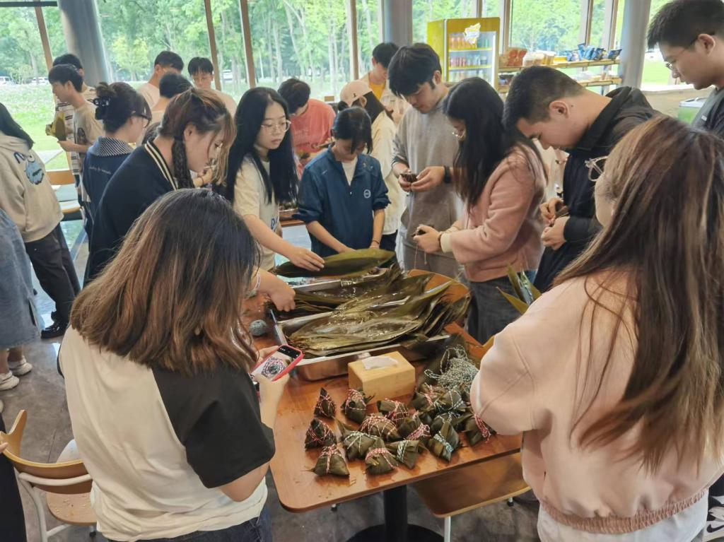 教学之后,同学们散开分别去包粽子。豆沙馅的甜口粽子和五花肉馅的咸口粽子,满足同学们不同的口味需求。随着容器里的粽子堆积得越来越多,大家的热情也越来越高涨。同学们围坐在一起,忙的不亦乐乎,现场欢声笑语不断,气氛欢乐轻松。