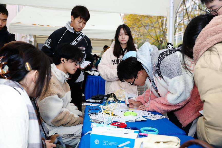 此外,互动区的下棋机器人、电子华容道、机器狗等数智体验项目以及先进师生团队事迹展板吸引了诸多师生驻足体验与观看。