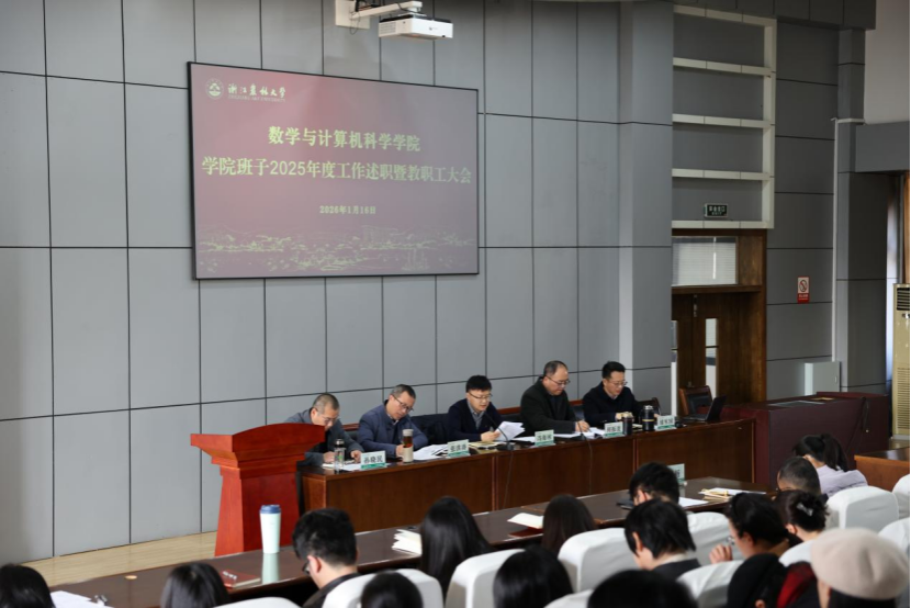 冯海林院长代表学院班子作2025年度工作述职报告,全面回顾了学院2025年的工作进展与成效。冯海林指出,在过去的一年,学院在多个关键领域取得了扎实进步:师资队伍建设取得历史性重大突破,成功引进国家级人才Thippa教授,填补了高层次人才的空白;教学改革不断向纵深推进,自主研发的智能辅助教学系统“天目学堂”在多门课程中得到应用,并推广至多所高校;科研工作稳步前行,获批多个国家基金项目和省基金项目,年度到位科研经费大幅增长,发表了众多高水平论文;产教融合开启崭新篇章,与临安区共建数字产业联盟,并成功举办多场行业大会;学生培养质量实现显著提升,毕业生就业落实率保持高位稳定,学科竞赛获奖数量在全校占比可观。